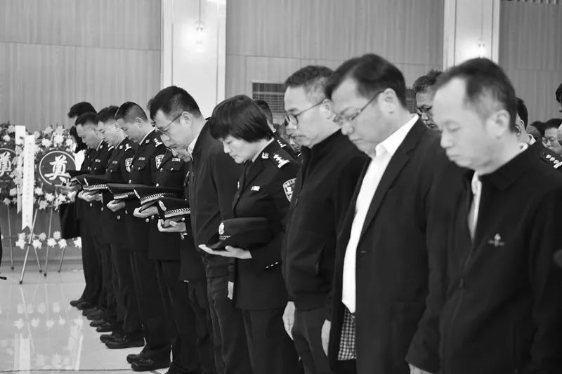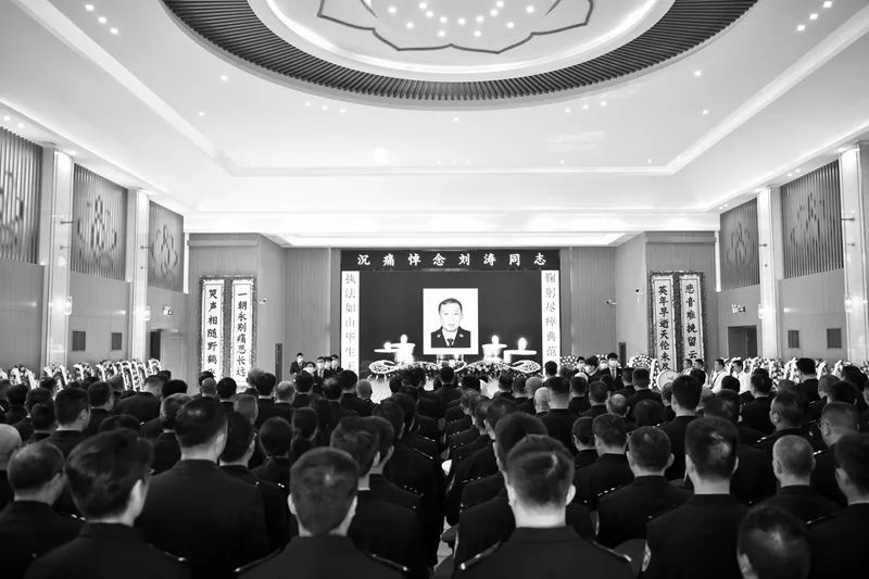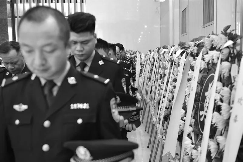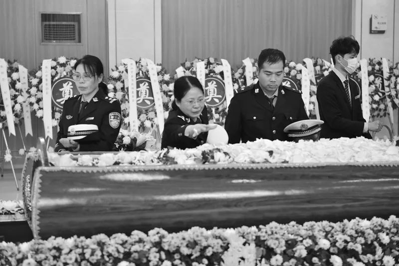 1月18日中午13时许,刘涛的告别仪式在三水区殡仪馆举行,空气中笼罩的白蒙蒙的迷雾缠绕着一排排白色花圈,寄托着他亲人、战友和好友的哀思。与刘涛诀别的人群中,刘涛的69岁老母亲拭去自己悲呛的泪水,颤抖着为儿子歌唱最后一曲,12岁的大儿子在旁紧紧牵着6岁弟弟的手,手里攥着一张纸条,轻声念着纸条上写给父亲的心里话,以此送别父亲最后一程