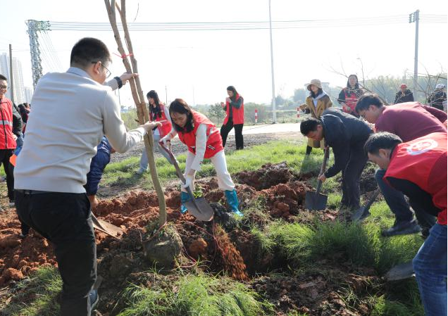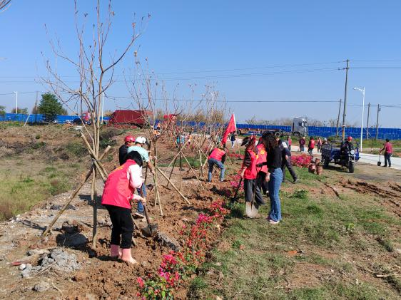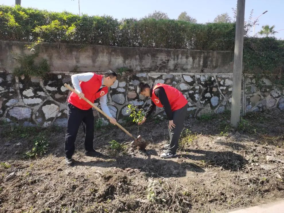 植树现场,大家分工合作,放苗扶正、挥锹培土、压实浇水,用实际行动描绘出芦苞绿意盎然的春景图,共种植了苗木1345棵、花卉930株。
