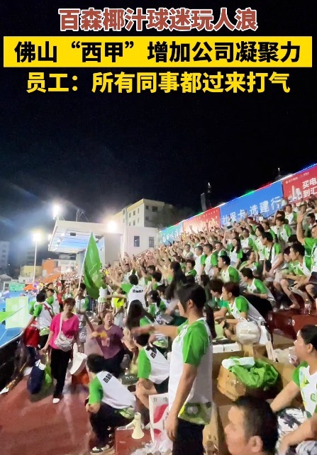 百森椰汁球迷现场玩人浪,#佛山西甲 增加公司凝聚力!员工齐呼:所有同事齐来打气!#2024享佛山看西甲