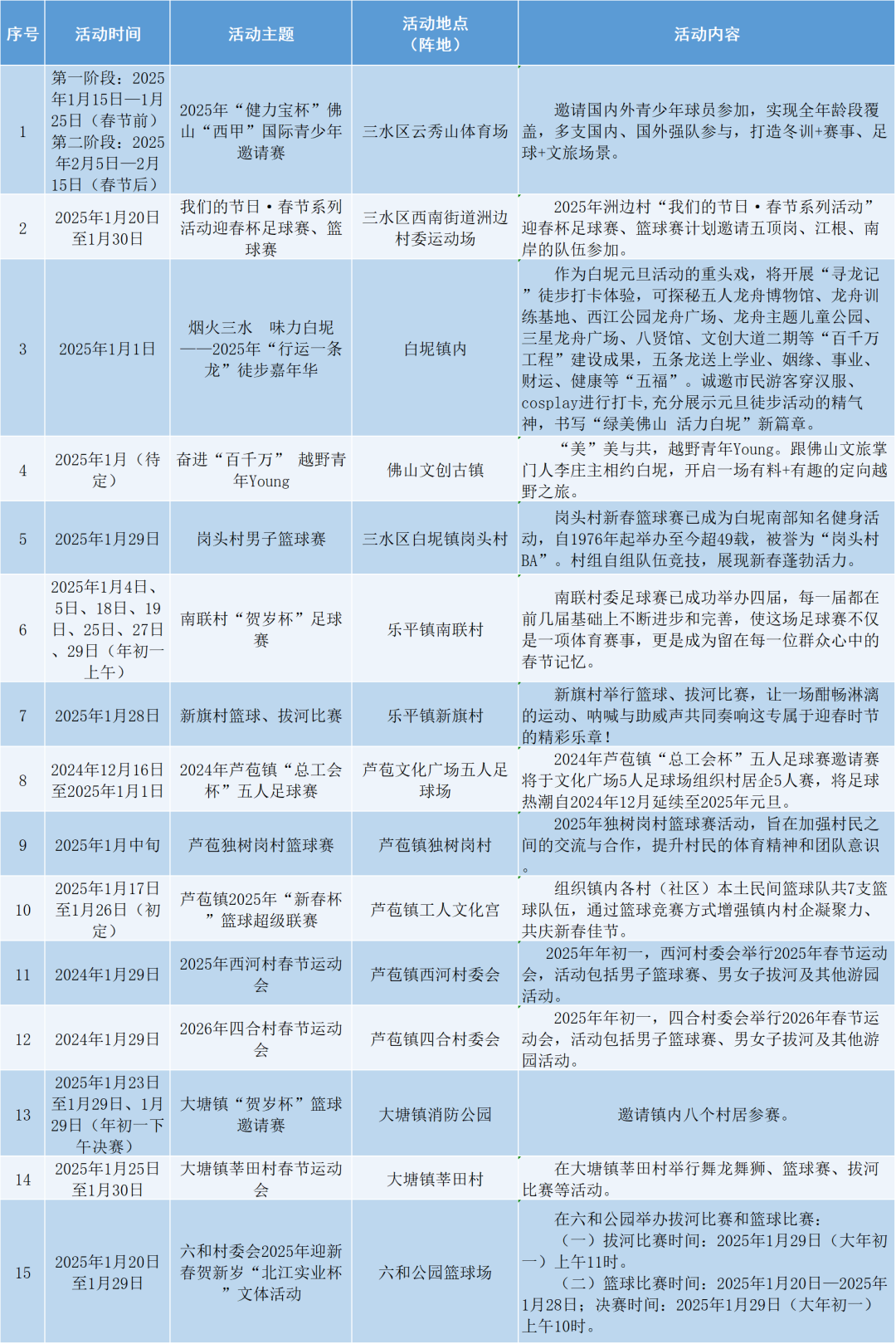 😍活动内容:活动贯穿新春佳节,春节前,大塘广场进行新春氛围布置,供群众拍照打卡,感受迎春热闹景象。大年初一“醒狮聚福 国泰民安”龙狮迎春,财神爷派利是,“贺岁杯”男子篮球赛决赛,展现大塘浓厚“年味”。元宵节“新春绘就新图景 大塘奏响振兴曲”元宵晚会,精彩节目轮番上演,为节后全面复工复产增添动力,全面开启新征程。