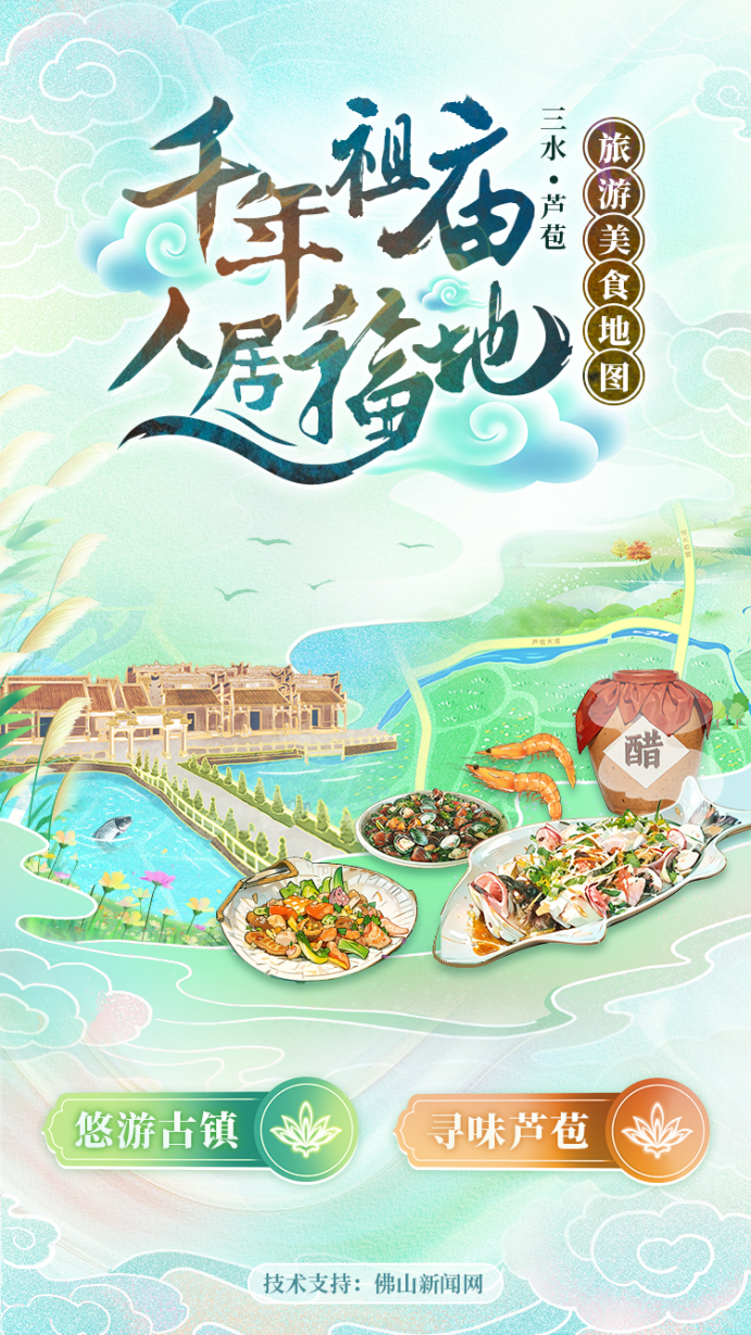 芦苞钟灵毓秀,文旅资源丰厚。这里不仅有胥江祖庙、北江大堤、400亩油菜花海、网红村落长岐、芦苞温泉度假村等景点,还有北江河鲜、长寿醋、芦苞腊味等美食驰名千里,是芦苞晶亮的文旅名片。为了方便广大游客,芦苞镇制作了芦苞旅游美食地图,以手绘的形式将芦苞景点、古村、农庄等一图收录。