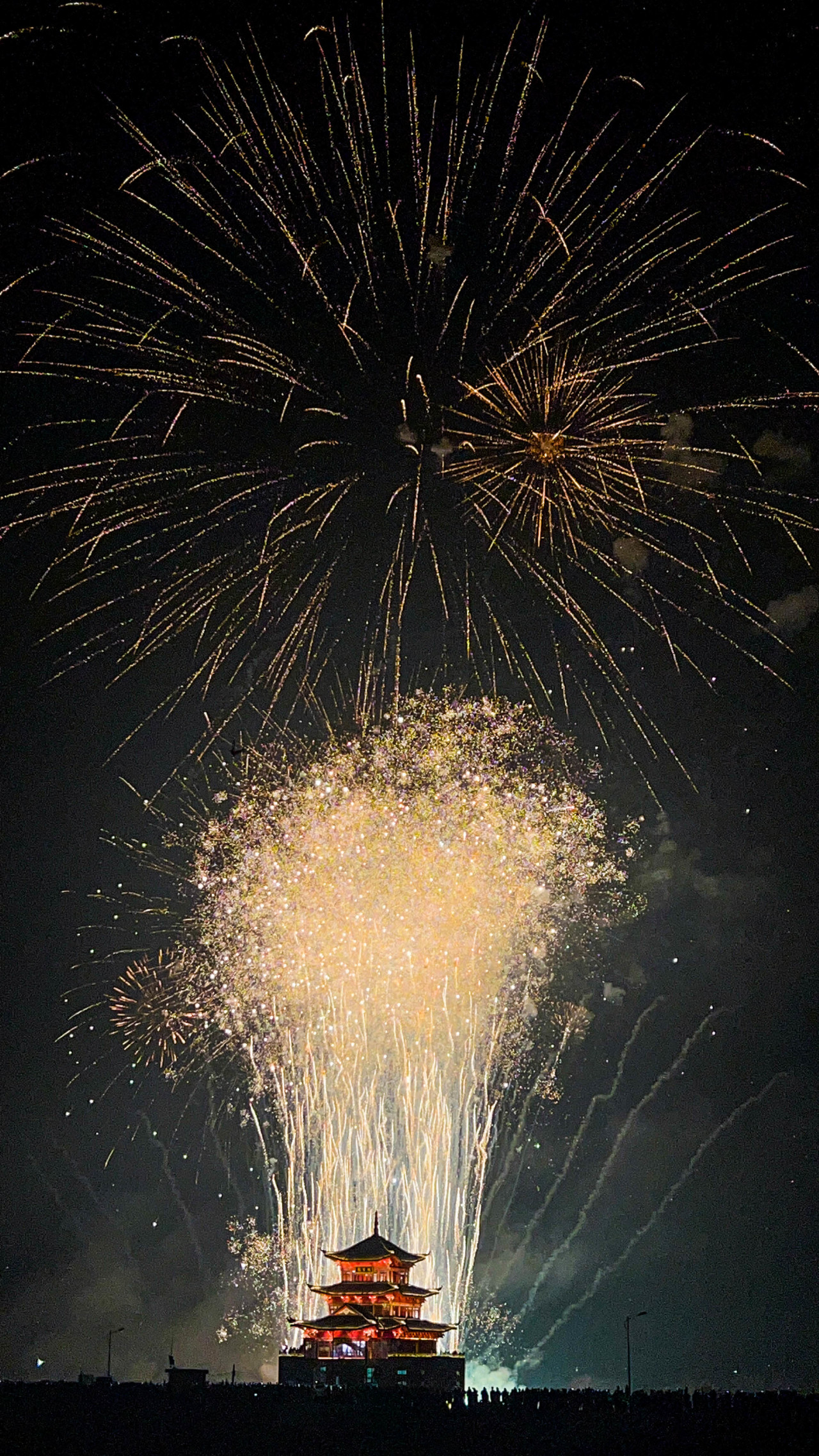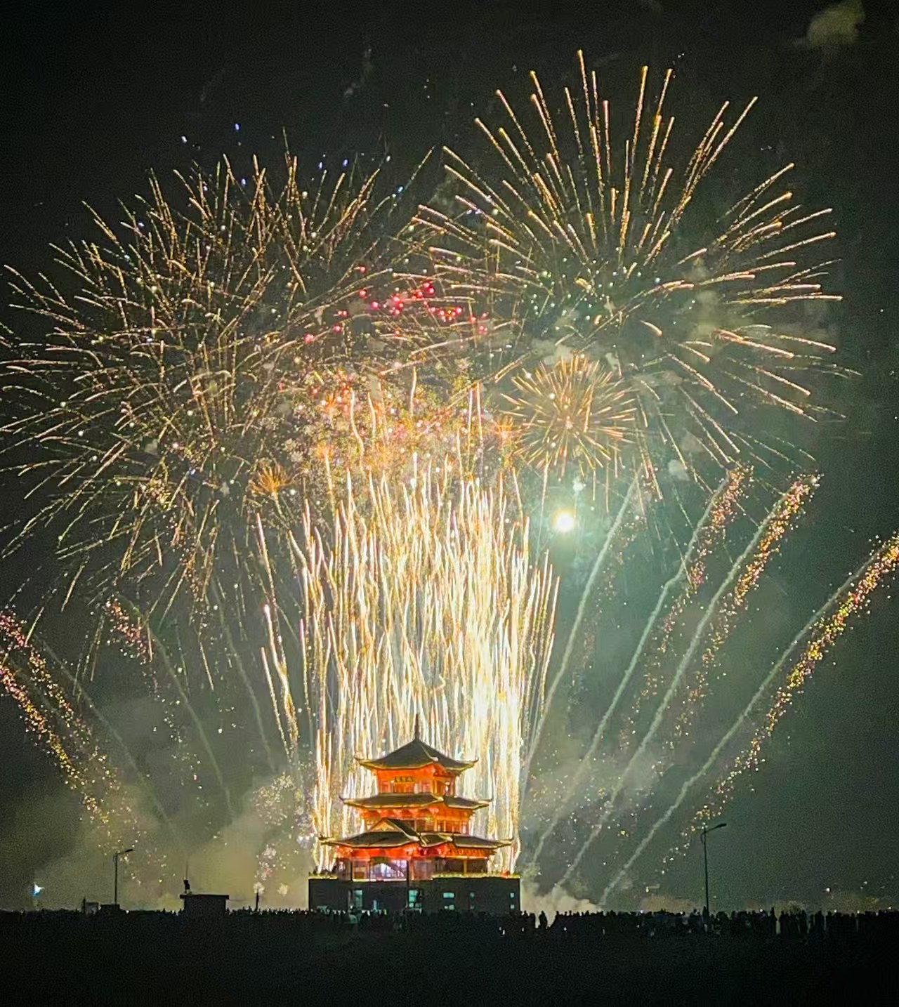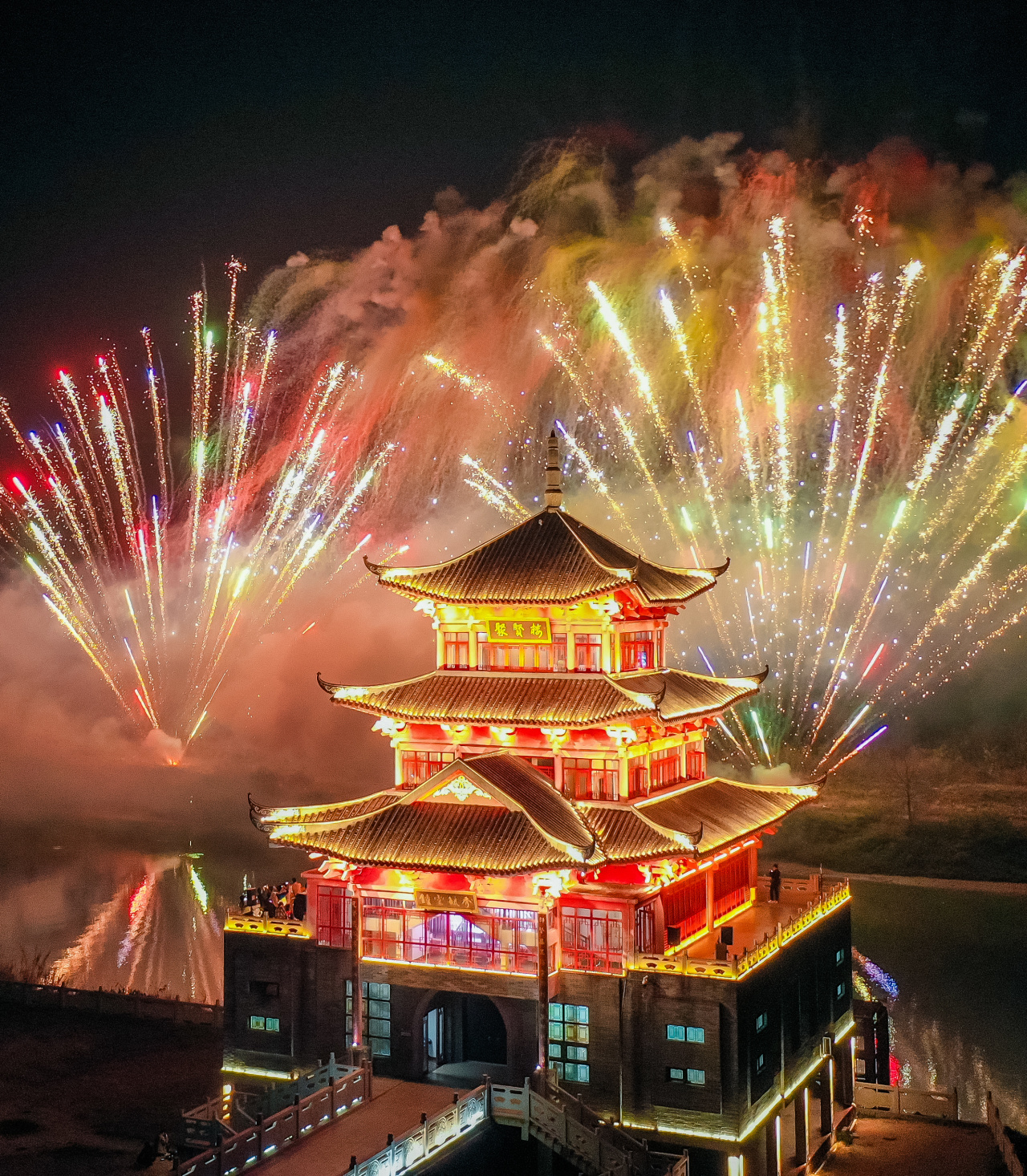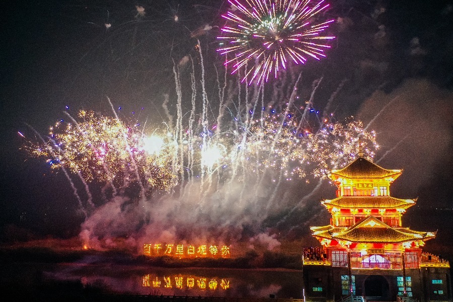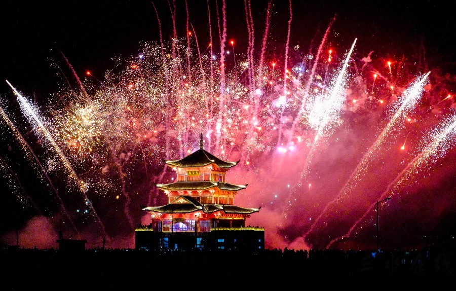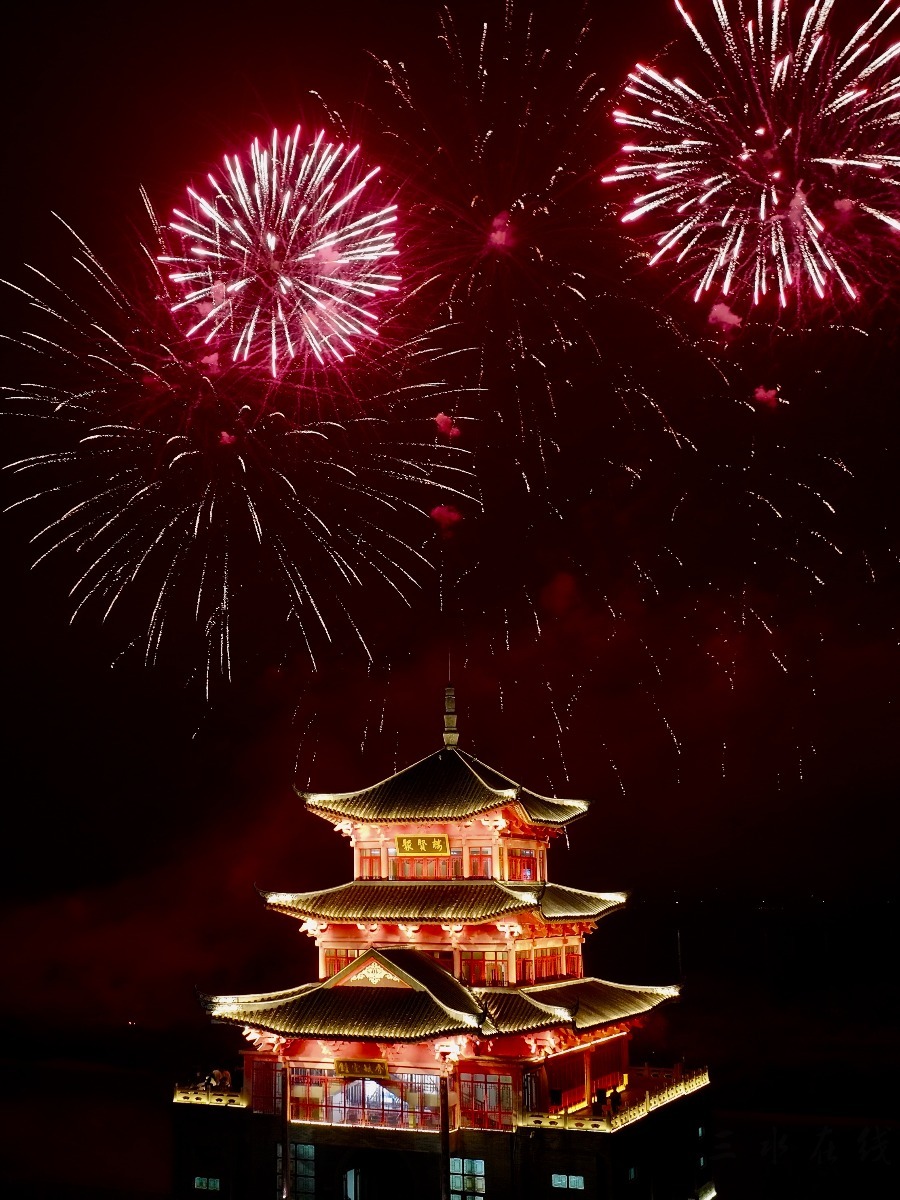 当晚,白坭镇西江畔流光溢彩,一场以“喜焰西江 福泽白坭”为主题的元宵烟花汇演在此盛大启幕。西江岸边人头攒动,聚贤楼畔灯火辉煌。随着第一枚烟花升空,“百千万里 白坭等你”字幕烟花瞬间被点亮,五彩斑斓的烟花在夜空中绽放,勾勒出一幅幅美丽的画卷。长达20分钟的表演中,巨型烟花与西江波光交相辉映,西江流入佛山第一栋地标性建筑——聚贤楼熠熠生辉,将现场气氛推向高潮。