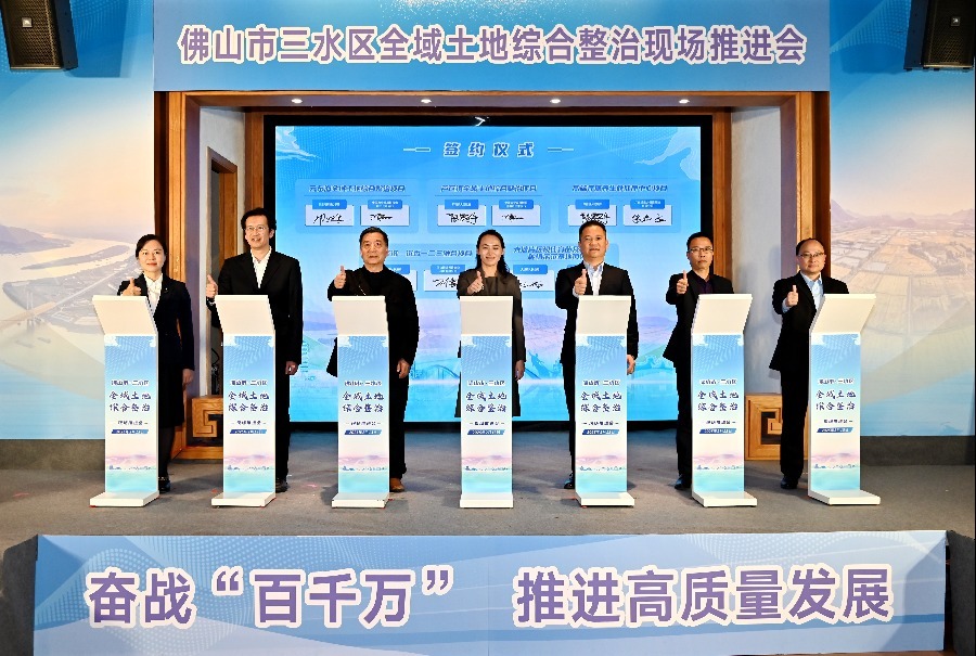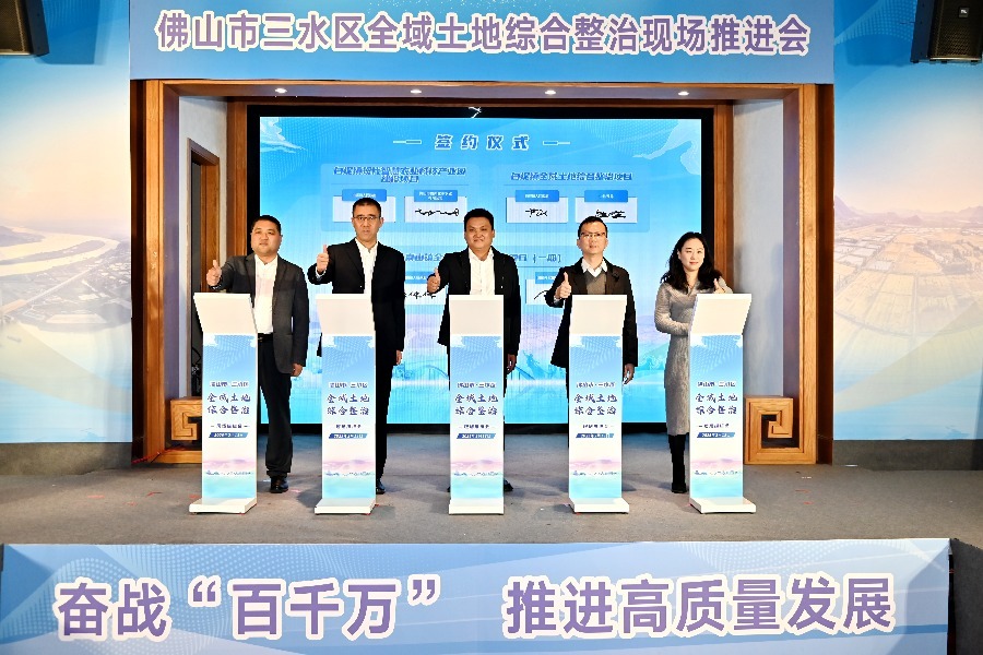 2月13日上午,三水区在南山镇举办全域土地综合整治现场推进会,组织与会代表参观漫江社区新农村示范社区、“千亩方”耕地集中整治区及智慧农业项目、旧街区风貌提升项目,大会邀请两家银行进行金融政策推介,由省市领导为各镇街全域土地综合整治项目进行授牌授旗,云东海全域土地综合整治项目、大塘片区现代育苗及标准化种植示范基地项目等七个镇街的12个投资项目进行现场签约,项目投资金额86.1亿元,银行授信金额63.9亿,标志着三水区2025年全域土地整治项目正式启动。