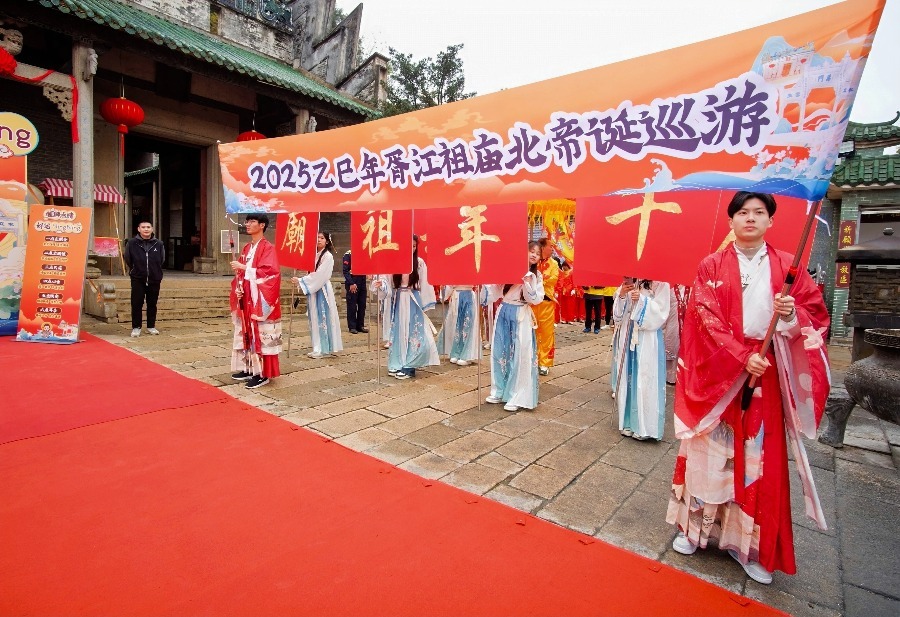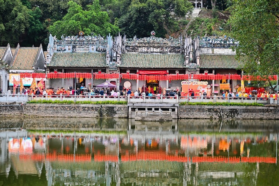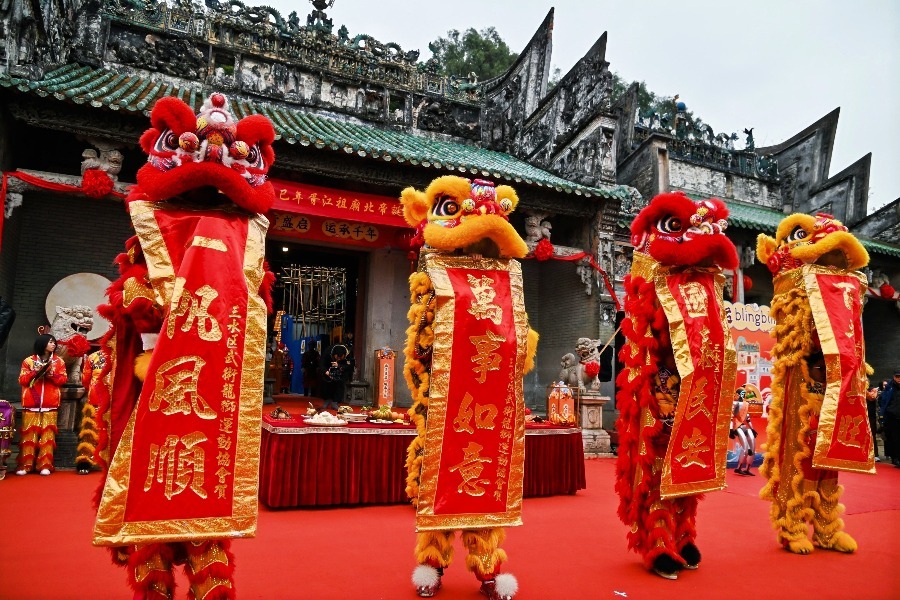 胥江祖庙前广场钟鼓齐鸣。一年一度的胥江祖庙庙会北帝诞庆典在钟鸣鼓动启幕。作为三水区省级非遗项目,胥江祖庙在广佛地区具有重要的影响力。今年的北帝诞庙会以“北帝盛启 运承千年”为主题,通过隆重的祭祀仪式和盛大的巡游活动,展示乡村振兴成果,再现千年传统。