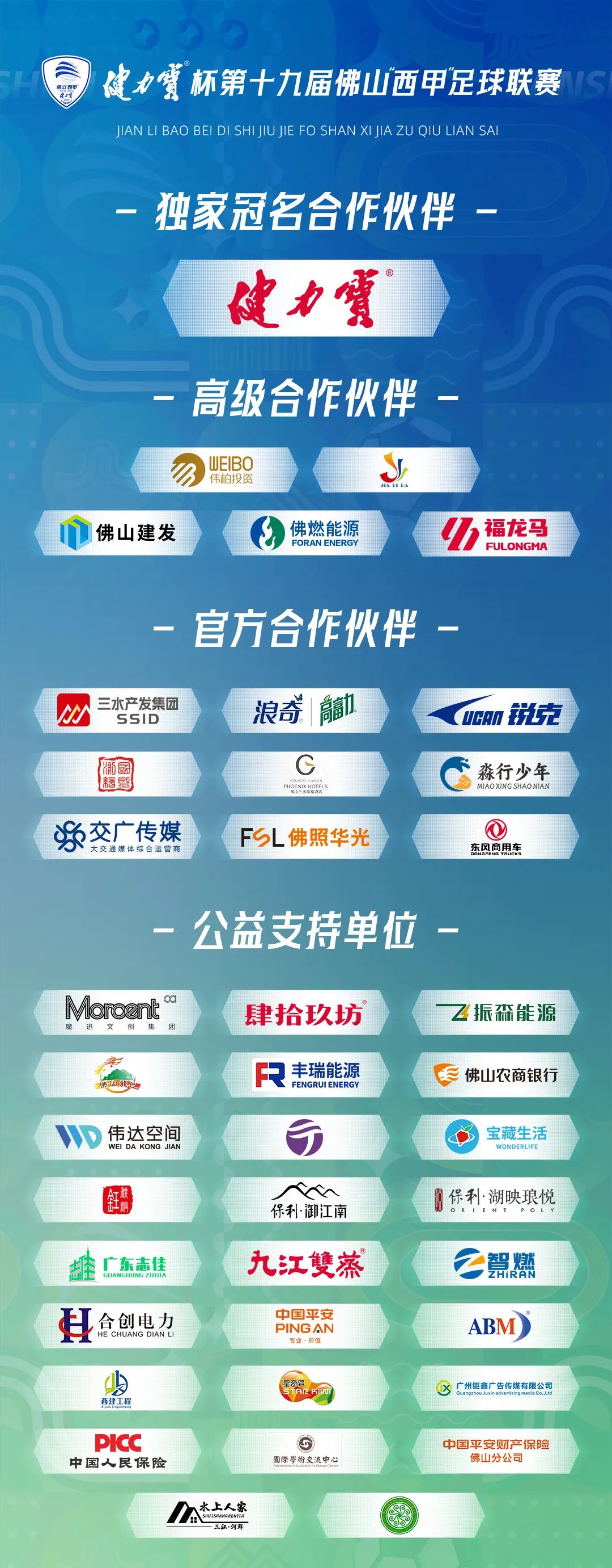 发布会同时官宣了抖音、懂球帝、广东体育频道、锐克等四大官方合作伙伴,以及佛山市三水伟柏投资管理有限公司、佛山市佳利达环保科技股份有限公司、佛山市三水能源有限公司、佛山建发产业园区开发有限公司、福龙马集团股份有限公司、广州轻工集团浪奇公司等65家实力支持单位组成强大后援阵容。浪奇公司市场总监蔡志霖表示 ,公司前期做了很多调研,佛山“西甲”有广泛的群众基础,有丰厚的历史沉淀,从街坊足球变成现象级IP,而浪奇也是根植广佛地区,有66年历史以及广泛的消费群体,面临走向全国的需求。“佛山‘西甲’和浪奇有共同特性、共同期望,合作水到渠成,将会达到共赢局面。”