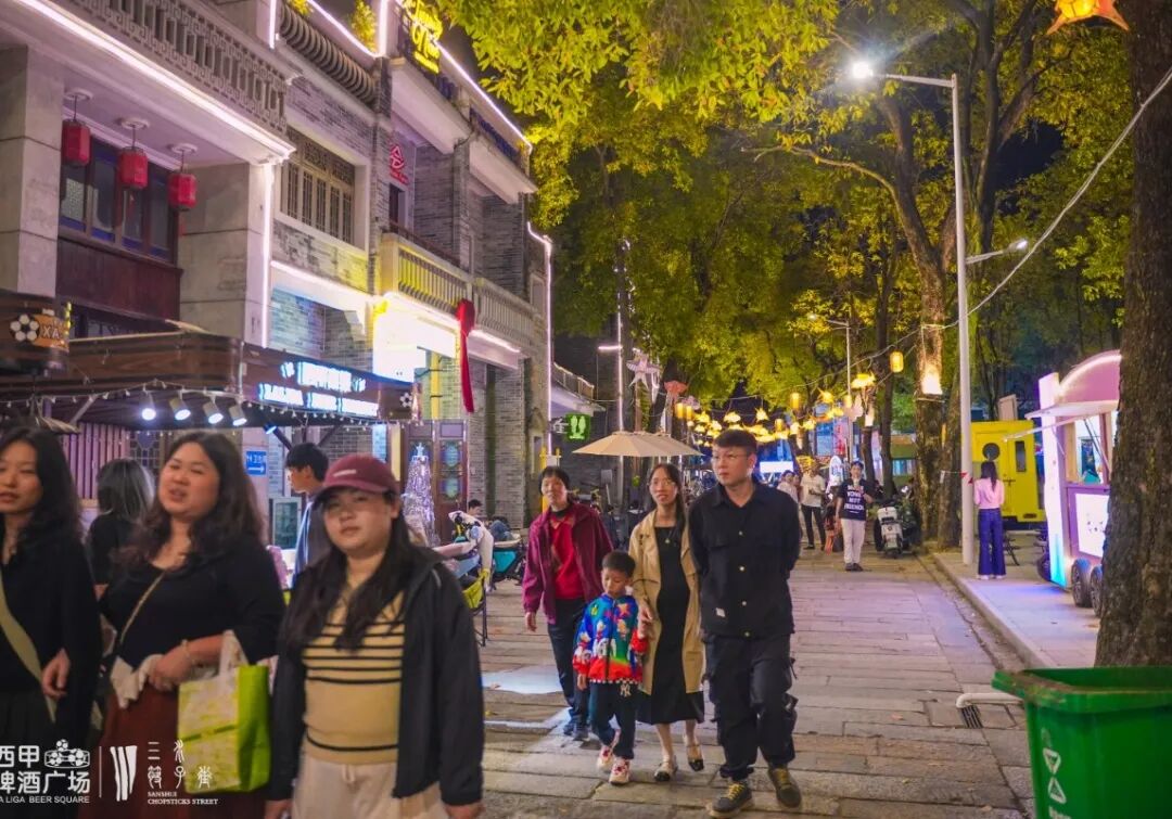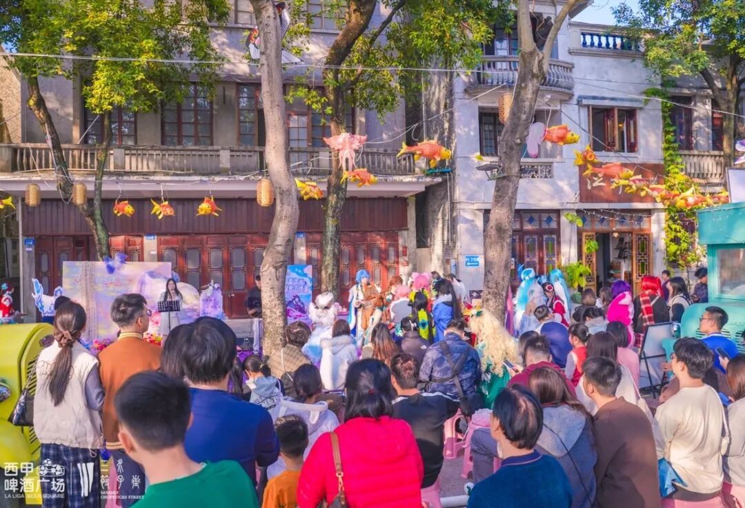 西甲啤酒广场音乐派对,歌手演唱、舞台互动、西甲市集同步进行,有效激活“夜购、夜食、夜娱”消费新场景。