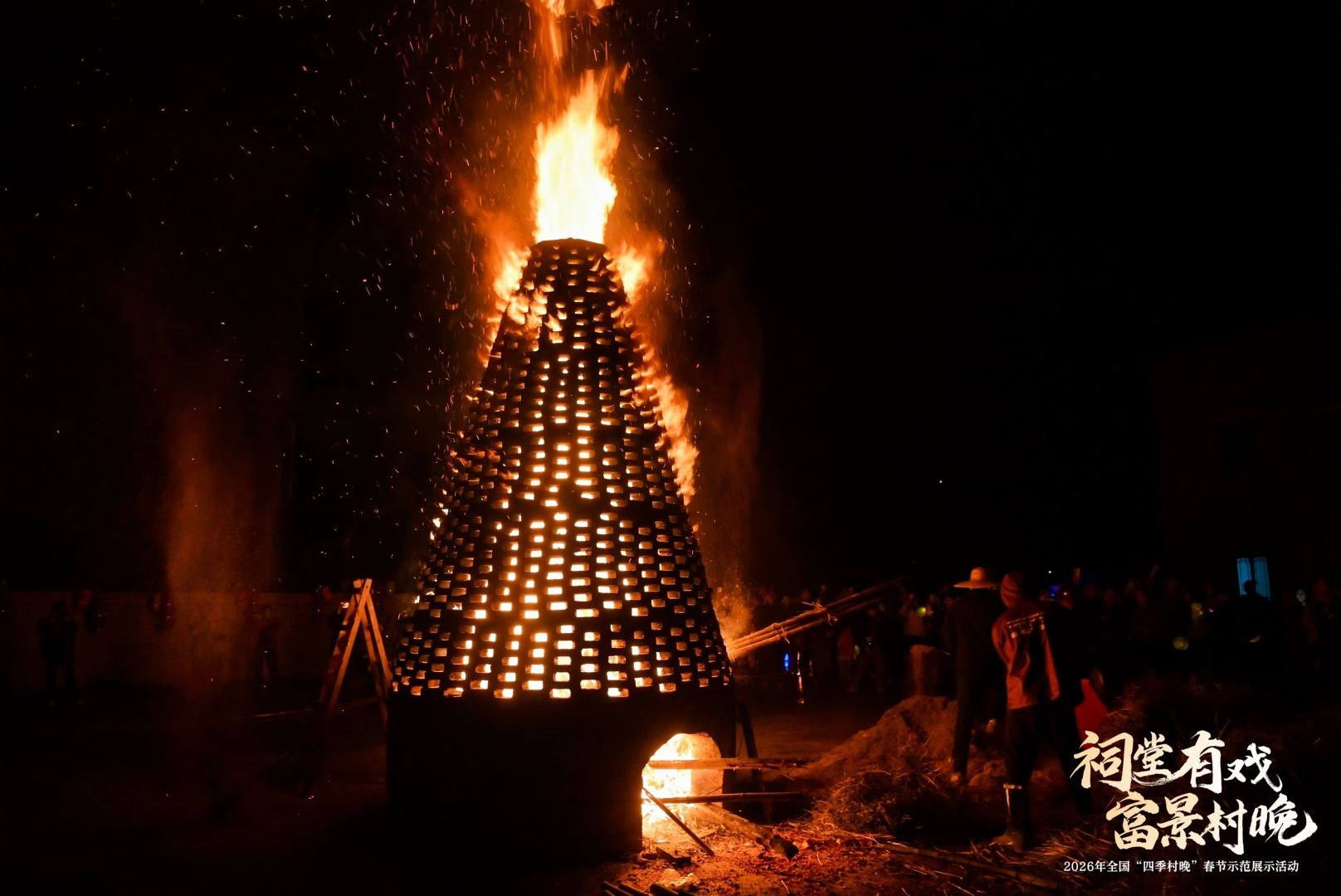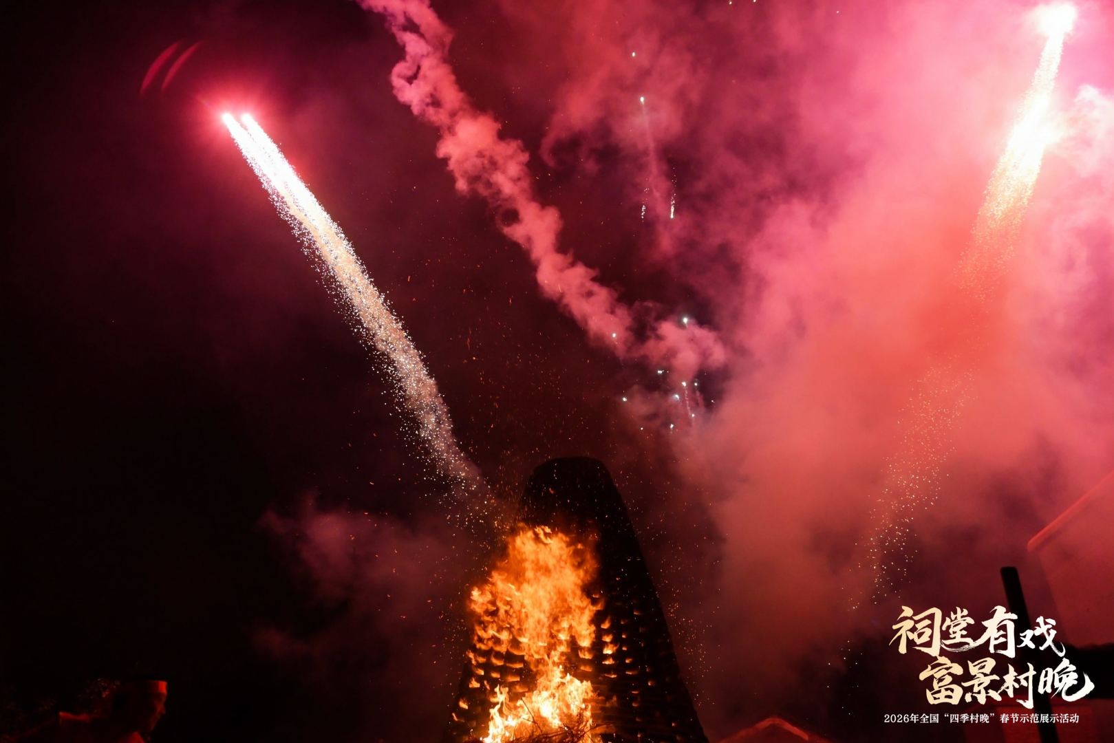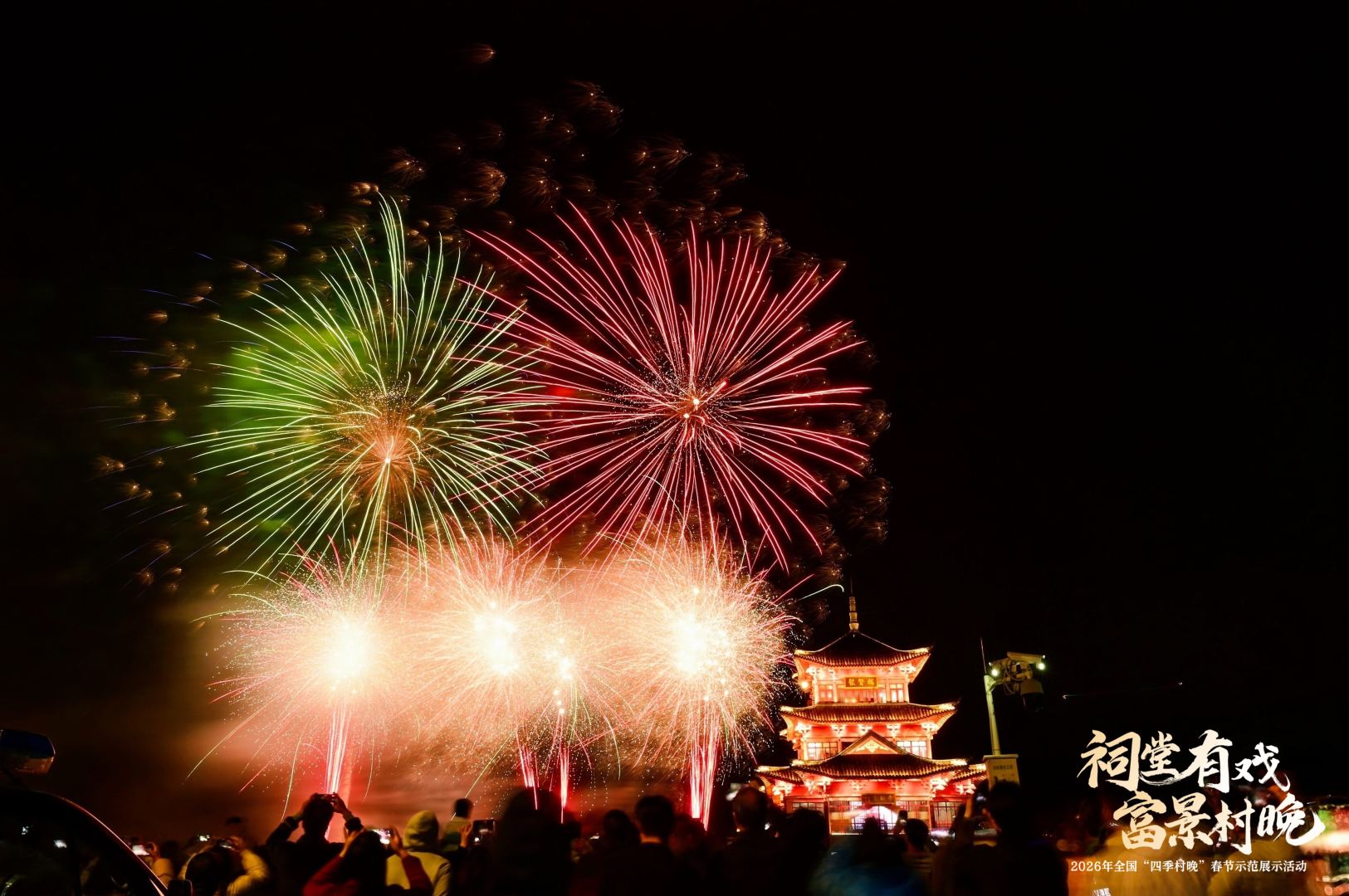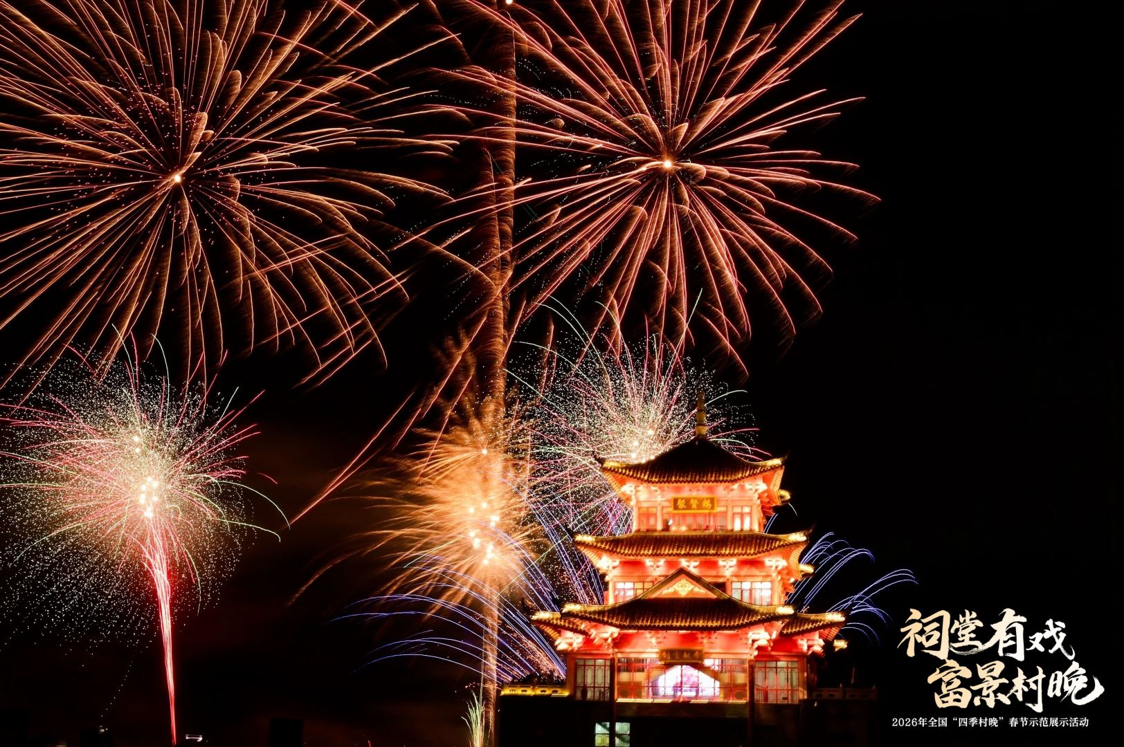 从添丁上灯、炸煎堆、包油角等民俗仪式续写孝善家风传承,到“家风润心·喜乐元宵”文艺晚会好戏连台,再到非遗烧番塔的火光与烟花秀共同点亮西江夜空——“祠堂有戏・富景村晚”2026 年全国“四季村晚”春节示范展示活动,不只是一次节庆的狂欢,更是一次乡村价值的集中亮相。