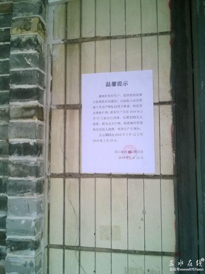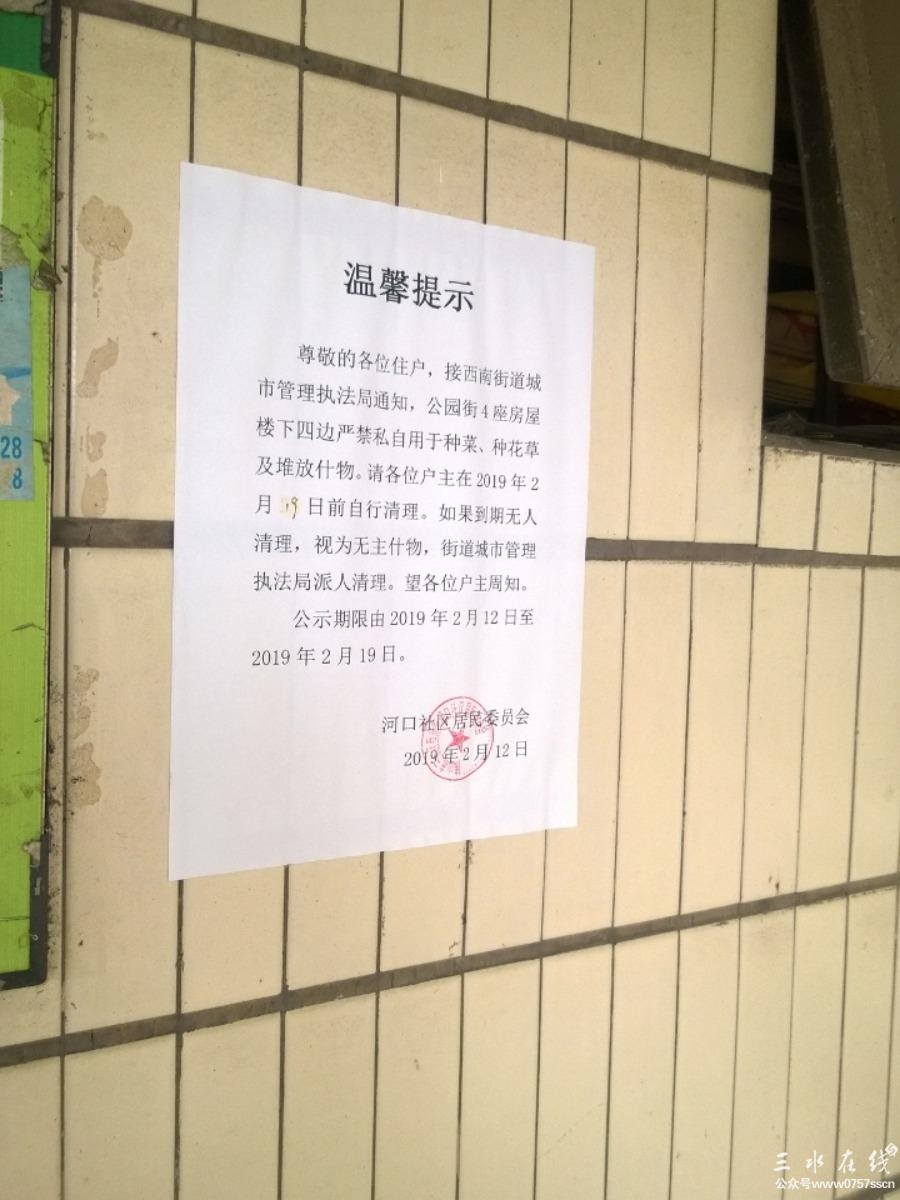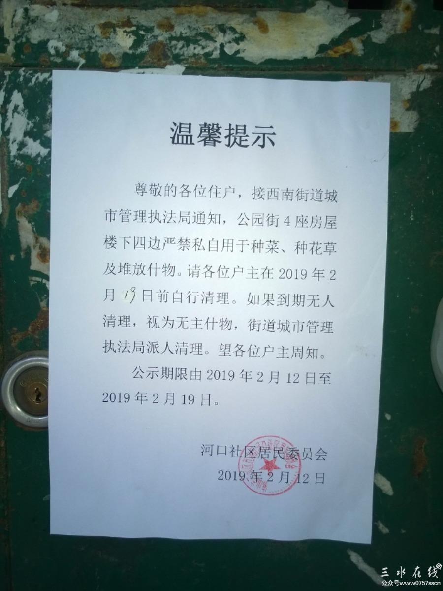 2019全程直击报道闻名久远的茶庄守护神"私家花园"最新状态:这是一个多年长期把大楼外大量市政公共场地作为"私家花园"的状况,在大楼外围拥有物业量惊人。在当年当时身为党员干部身份的茶庄主人是时常有着惊人超越国宾式警车数量频繁密集地在茶庄前后门的“私家花园”坐镇呈现于众,在那时的盛况简直可以号称国内看护力度最强盘景、茶庄,气焰嚣张恶霸一方(当时详情可直接到本地邻站“xinss"中搜索本号同名“ss牛锁”进空间看旧帖)。由当时曝光至今警车没踪影许久了就剩几条大铁链与几支摄像枪逞恶。但在当前扫黑除恶大形势下和对环境要求强烈反映下,终于对该大楼作出的严厉责令整改,并对大楼各户门前、外墙各处张贴通知告示,作出要求如有此行为的一同相应处理。而这属于茶庄守护神的“私家花园"以及其中“盘景"、“大型花草树木"、“洗手盘"、“大石头"之类有部分是否会享有特权特批得以保留呢?茶庄守护神是否真能遵守责令配合全面自行清拆处理呢?又或者这头茶庄守护神只是自行清理一部分后再寻找各种理由等待时机恢复呢?更或者钻空位选择抗法呢?……等等这些都会密切关注跟进中,会持续逐步更新,如有延时不及时更新补充望理解!最终会以现场实图反映事实结果的。这次对于此种行为,希望能真正做到“有法可依、有法必依、执法必严、违法必究”。希望能够按所公示所要求的彻底执行清除处理。对此非法违规行为不允许留有特殊待遇,对此地此类盘景、树木、大石头等杂物必须不能留有就地保留的特权,严防死灰复燃。对于打黑除恶,正确的环境治理,凡是有助于建设文明社会打击恶霸的举措,群众是绝对拥护支持的!最后,在这公告出示时起,群众就待看执法力度如何了,希望看到的是不会存有特权特殊待遇化、变相合法化的严正执法行动力,否则将再造成对市政公共场地”先占先得,多占多得“的恶性循环后果。 (该大楼四周杂物目前正在清理中,具体进展结果如何有待实图更新。)