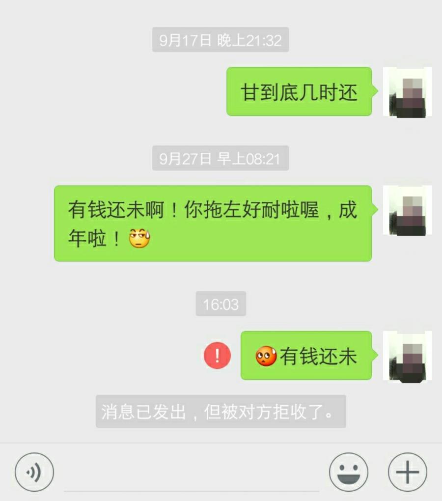 后来当我叫他还钱,他便开始翻脸不认人了,突然间把我微信拉黑,拉黑我电话,还换电话号码,还假装说不认识我否认借钱这回事(后来用其他微信加过他,加一次拉黑我一次)。不还钱一拖差不多2年了(难怪当时叫他写借据,他死都不愿意)