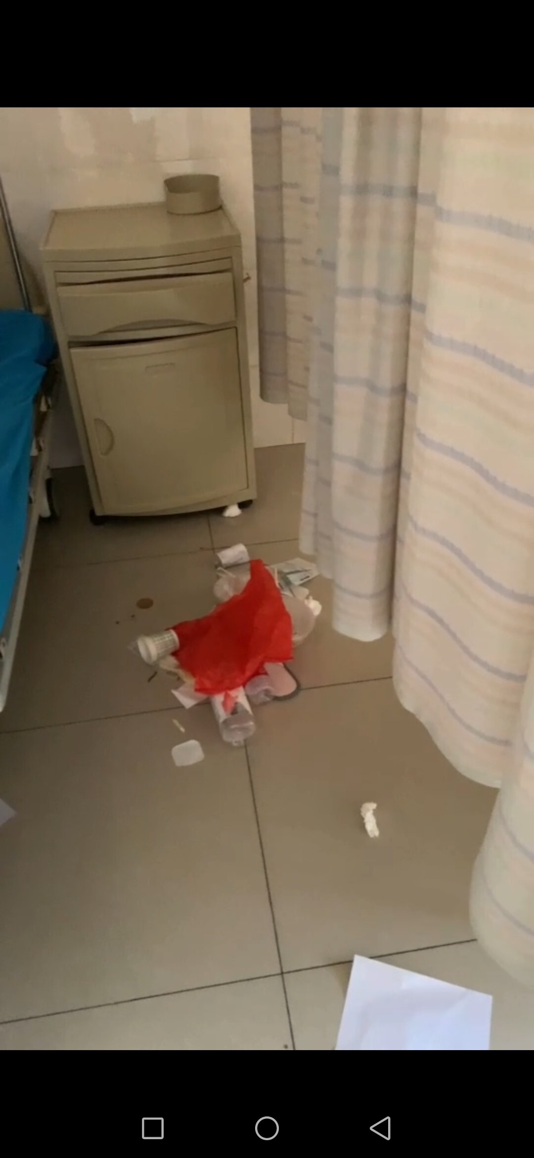 (病人因为被护士催去照B超,早上清理了一部分垃圾,未来得及清理剩下的,昨天手术完,污物多,袋子已经用完,后来家属又走了,得病人一个在,休息一晚,好了一点,病人本人就已经马上清理了。住了三四天,只有今天早上有垃圾,足够证明,病人本人并不是喜欢随地扔垃圾的人。)