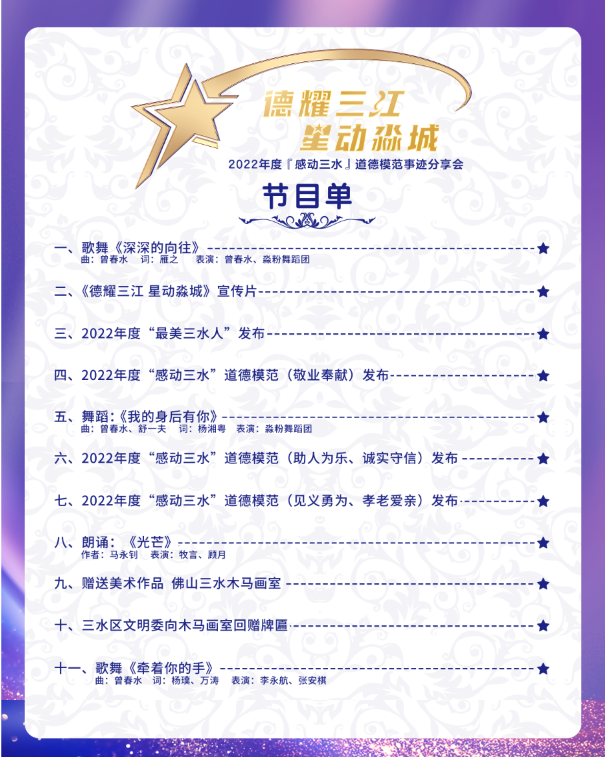 今年的分享会 ,感动常在,温暖依旧。10位“感动三水”道德模范和10位“最美三水人”将集体亮相,三水区木马画室将为10位“感动三水”道德模范赠送绘画作品。此外,活动现场还将有歌舞表演、诗歌朗诵等节目上演,为晚会增添更多精彩。
