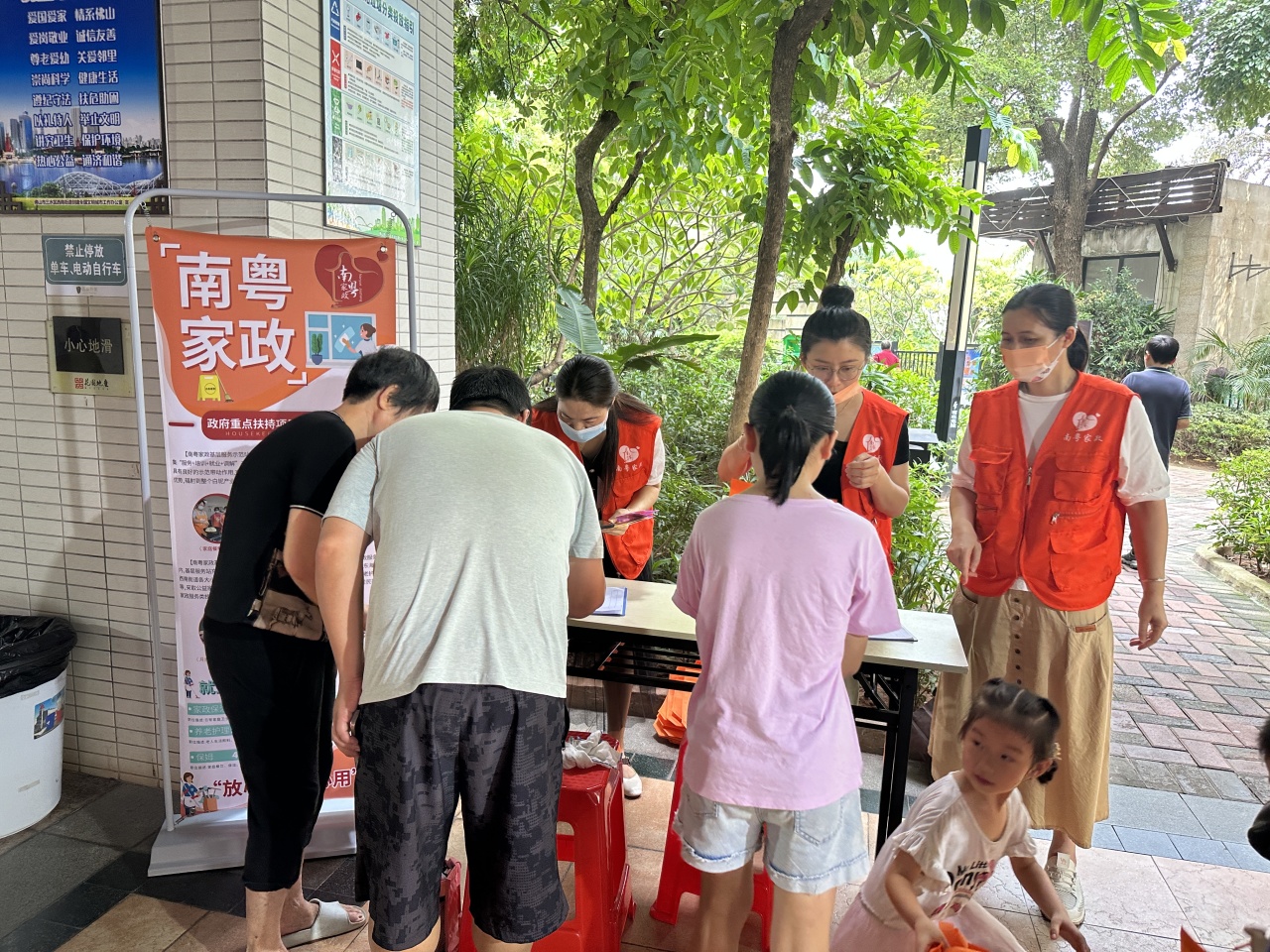 为加深居民群众对“南粤家政”工程的了解,更好地服务民生和促进就业,打造名片式家政品牌 。2023年8月19日,“南粤家政”基层服务示范站在山水壹品小区开展宣传活动,活动以摆摊设点、派发传单、培训推广等形式开展。