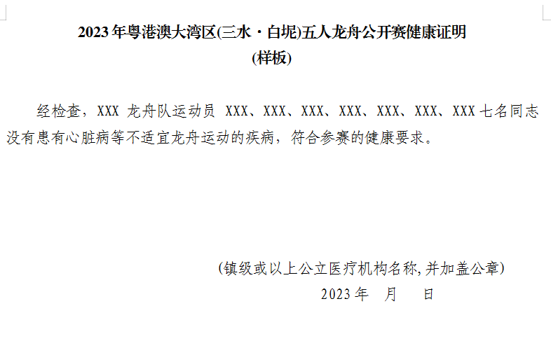 (四)所有参赛运动员必须经医疗部门(镇级或以上公立医院)检查(项目包括但不限于心电图、血压、内外科基本检查等)证明身体健康,且能着装游泳200米以上。本地组参赛运动员体检时间、地点由各村居统一安排,具体以村居通知为准,体检费用由各参赛单位自行负责。