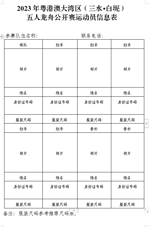 1、2023年8月30日上午9时至9月2日下午5时开放公开组网络报名小程序入口,报名参赛队伍按照小程序要求填报及上传“2023年粤港澳大湾区(三水·白坭)五人龙舟公开赛报名表”、“2023年粤港澳大湾区(三水·白坭)五人龙舟公开赛运动员信息表”(小程序开放期间可以修改,超时不接受任何变更),要求至少填报1名领队(不能参与比赛)、5名队员资料(队员资料经网络报名后不得修改,2名替补队员可在提交纸质材料时补充填报)。9月3日将在“白坭发布”微信公众号对小程序报名名单进行公示。