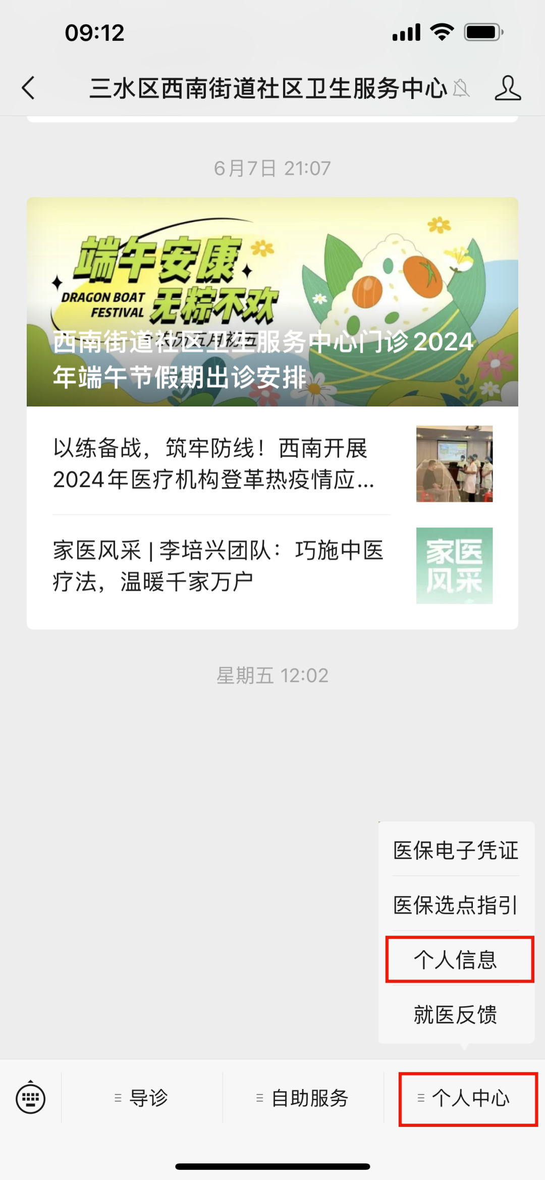 关注三水区西南街道社区卫生服务中心微信服务号,打开主页面底部菜单“个人中心”,点击“个人信息”进入个人信息绑定界面。