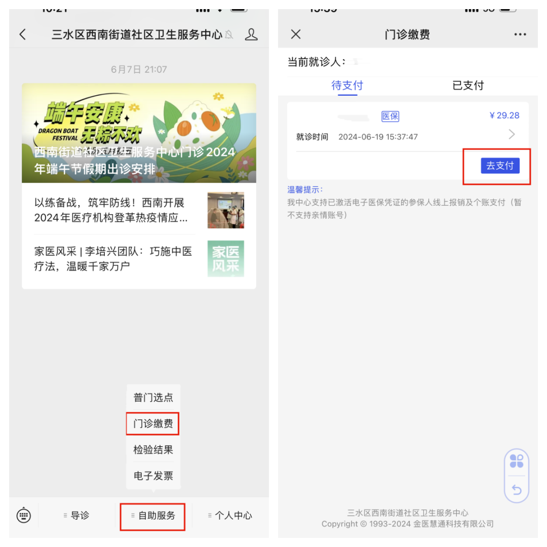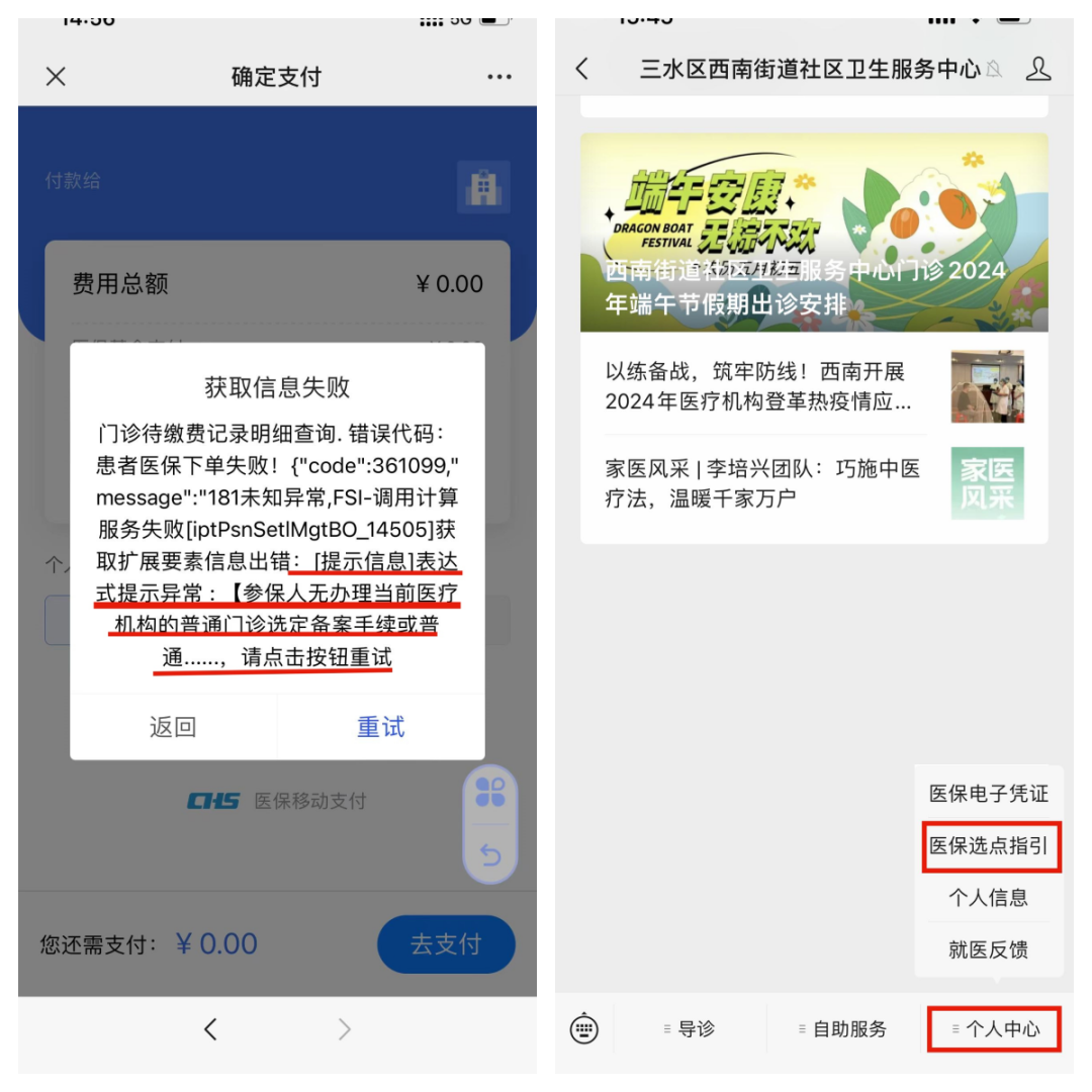 如结算提示:“参保人无办理当前医疗机构的普通门诊选定备案手续”,请返回三水区西南街道社区卫生服务中心微信服务号的“个人中心”点击“医保选点指引”进行门诊选点登记。