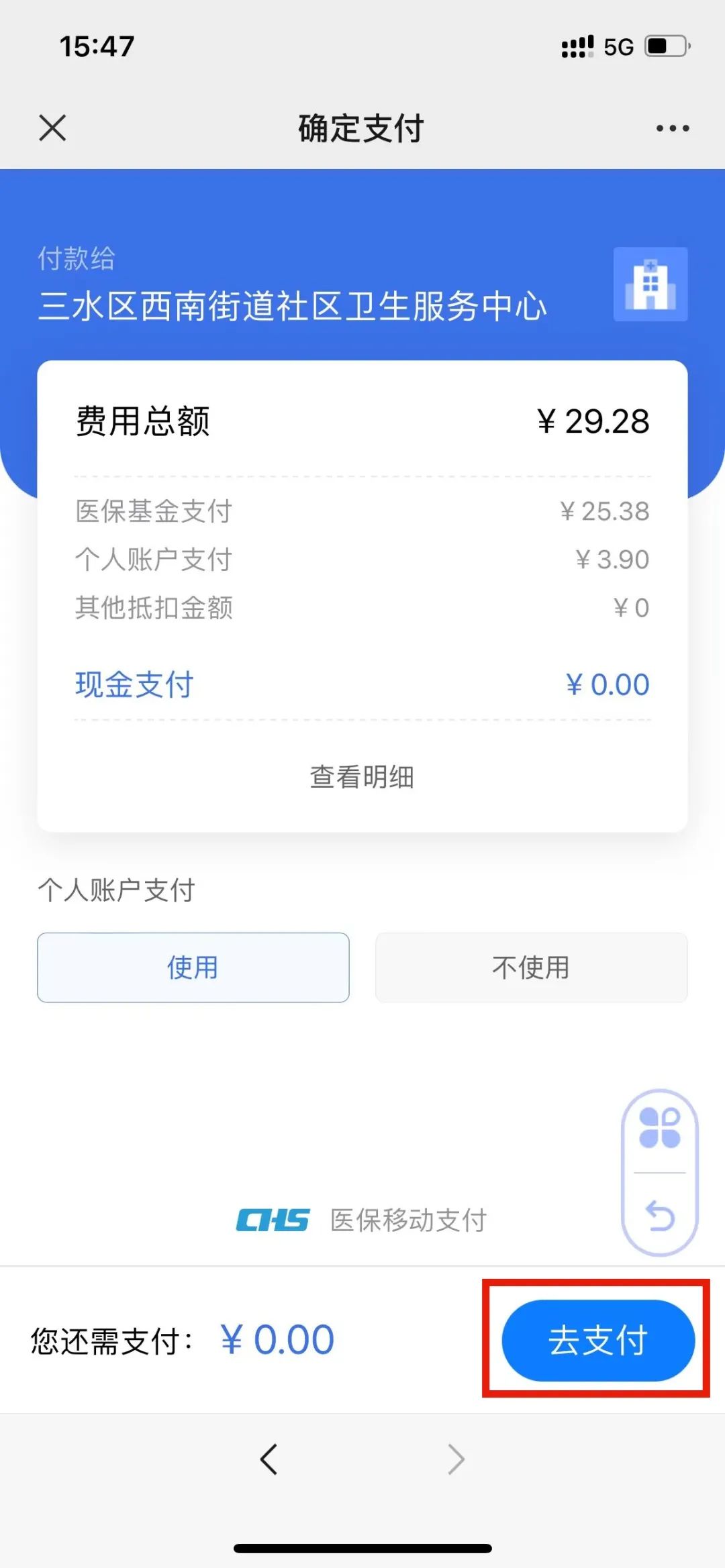 如医保个账余额不足或不想使用医保个人账户支付,请点击“不使用”按钮使用微信支付。