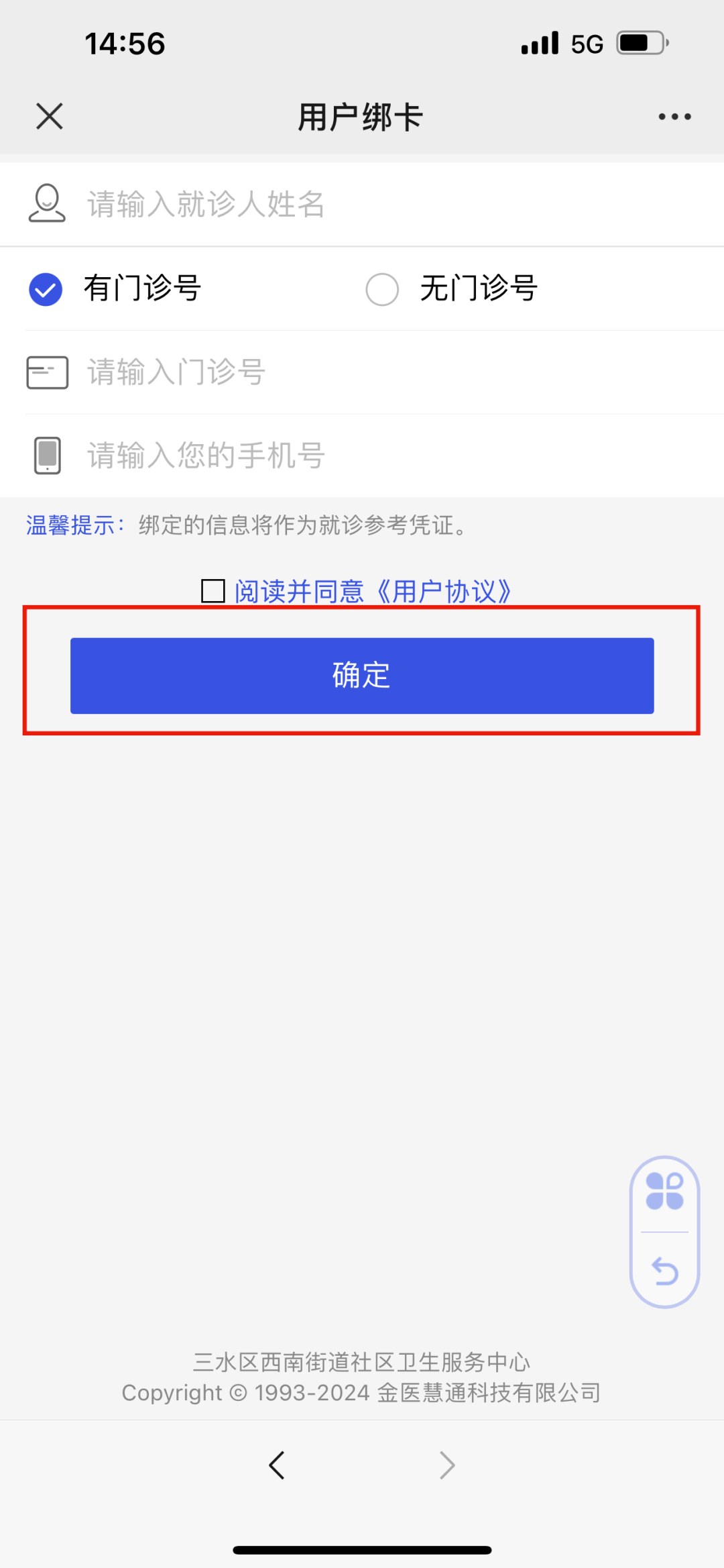 在用户绑卡界面,根据提示要求录入个人信息后再点击“确认”即可完成个人信息绑定。如不清楚是否有“门诊号”,请直接选择“无门诊号”绑定。