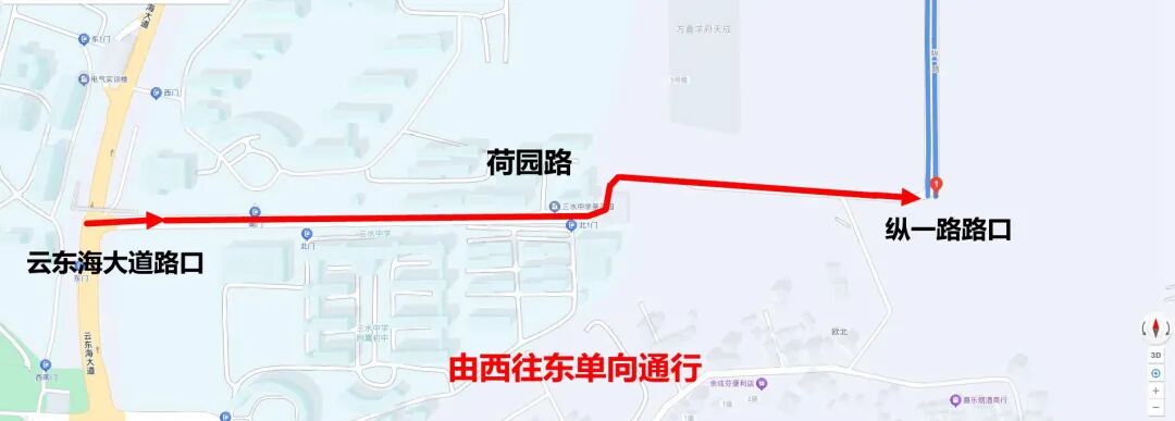 为缓解三水中学及其附属初中学生上、下学期间校园周边道路交通拥堵,保障道路交通安全、畅通,根据《中华人民共和国道路交通安全法》有关规定,三水公安决定从12月10日起对云东海街道荷园路(云东海大道路口至纵一路路口路段)实施限时交通管制,该路段逢周五、周日15时至19时期间实行由西往东单向通行。