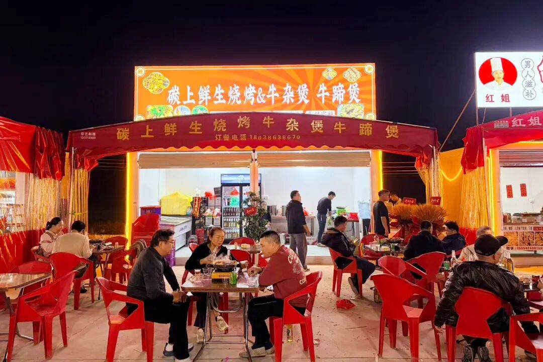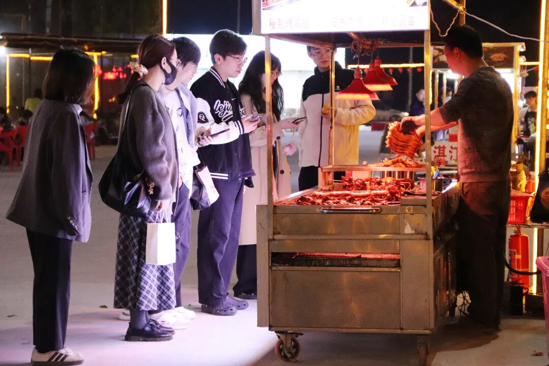 摊位前,人们纷纷驻足,等待着一份份热气腾腾的美食。石锅烤鱼、新疆烤串、麻辣烫、碳烤生蚝、荔枝木烧鸡、特色牛杂等各式美味应有尽有,浓浓的烟火气息驱散了冬夜的寒意。