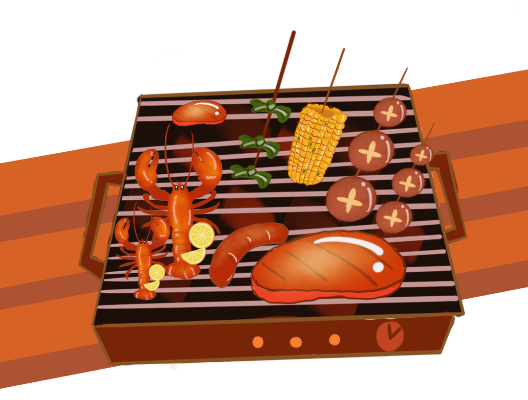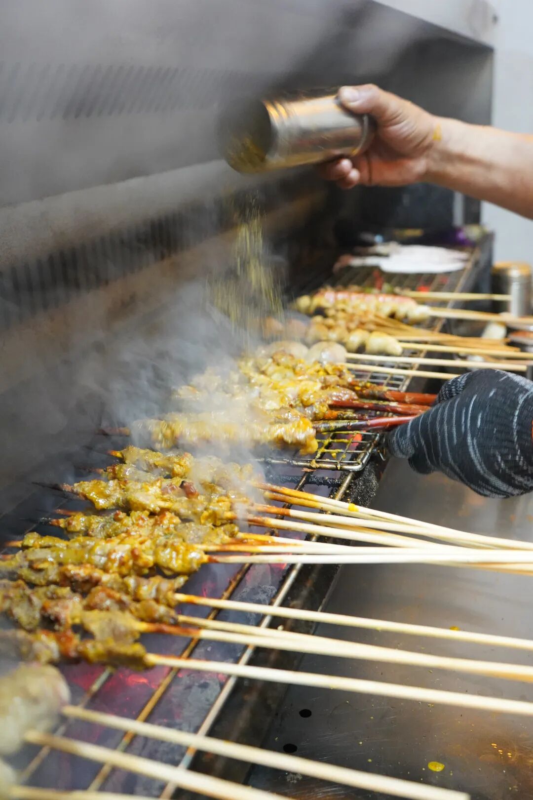 新疆烤串摊主熟练地翻动着烤架上的肉串,撒上孜然和辣椒面,炭火跳动,肉串被烤得泛出诱人的油光,佐料一撒,香气被火苗燎得四散。