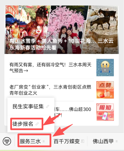 关注“三水发布”微信公众号,在菜单栏找到【服务三水】-【徒步报名】,点击进入佛山50公里徒步报名页面。