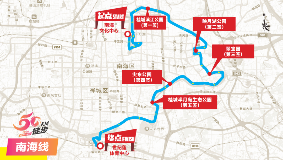 西江国际游艇会(起点沿江中路)→荷城苏村→沿江路→滨荷Park生态文创园→荷城公园→世纪广场(第一签)→灵龟公园→高明大桥(旧桥)→龙高路(加油站)→新田村健身步道→樵高路(海舟三乡路口)→儒溪村→环山大道→南海博物馆(第二签)→环山花海→环山绿道→山根新村→南海中学(第三签)→西樵大桥→北江东岸(第四签)→沿江路→南庄一桥→南乐大桥桥底(补给点)→罗格围南线→周尾围生态公园→凤翔大桥→江滨路→青年公园(第五签)→江滨路→东平路→东平大桥→滨河景观公园→世纪莲体育中心(终点)。
