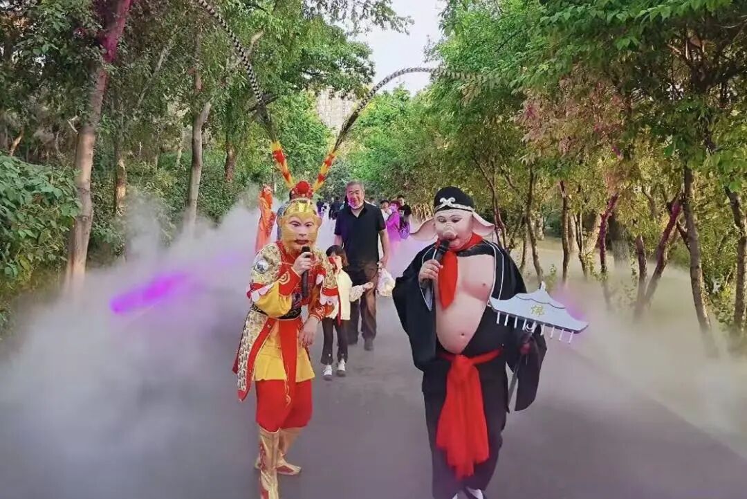 穿越时空: 恐龙展+西游记师徒巡游,大圣与恐龙同框 。