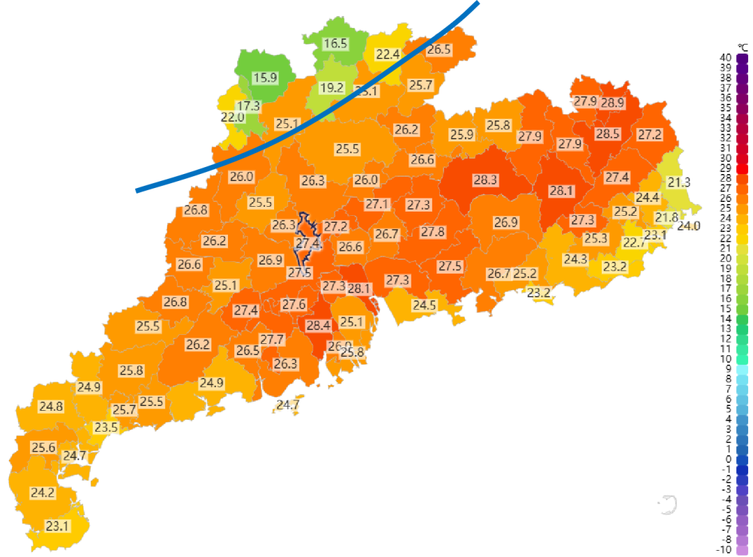 17时,冷空气进入粤北,韶关北部、清远北部已经出现明显降温和大风,部分地区出现零星小雨。