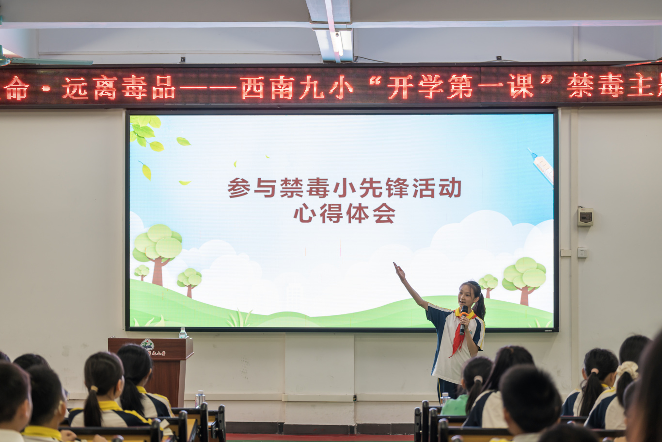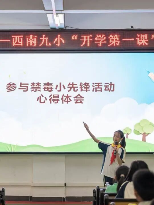 本次活动以统一时间、统一主题、统一流程的方式,在西南街道22所小学同步启动,真正实现辖区小学禁毒宣传全覆盖。各校园内宣讲秩序井然、氛围热烈,禁毒小先锋们化身“小小宣讲员”,精神抖擞、自信从容地站上讲台,用清晰洪亮的声音、大方得体的仪态,向在场同学分享禁毒知识、讲解防范要点。宣讲过程中,小先锋们准备充分、表达流畅,对新型毒品的伪装形式、辨别方法、危害影响等内容讲解细致到位,充分展现了前期培训成果与良好的综合素养。在场学生认真倾听、积极互动,在问答环节主动举手、踊跃参与,在沉浸式体验中加深对禁毒知识的理解与记忆。整场活动主题鲜明、形式鲜活,既强化了学生们的自我保护意识,也让禁毒宣传真正走进校园、走近每一位青少年。