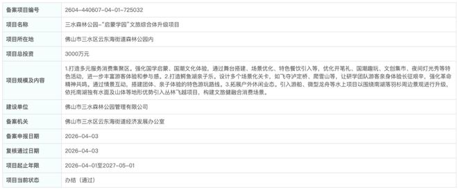 重磅利好!三水人家门口的 “城市绿肺” 要大变样!总投资3000 万元的三水森林公园 “启蒙学园” 文旅综合体升级项目已正式备案,将于2026 年 4 月至 2027 年 5 月全面动工!未来一年多,这座陪伴我们多年的森林公园,将集国学文化、亲子游乐、户外探险于一体,变身三水全新文旅地标!