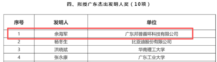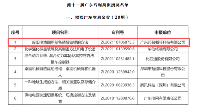 据最新消息,广东邦普循环科技有限公司凭借“废旧电池回用制备磷酸铁锂的方法”荣获广东专利金奖,公司余海军获评广东杰出发明人奖;佛山市恒力泰机械有限公司亦凭借优质专利成果,荣获广东专利优秀奖。